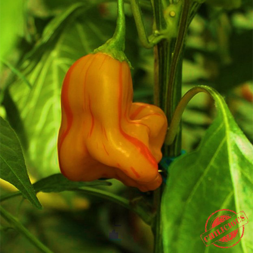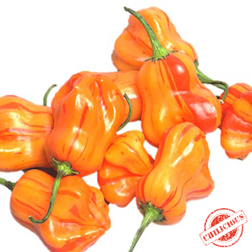 Wie ein kleines Sonnenuntergangsgemälde hängt sie an ihrer kräftigen Pflanze: erst grün, dann crèmefarben, dann orange – und plötzlich durchzogen von tiefroten Linien, als hätte ein übermütiger Künstler mit feinem Pinsel die Glut des Tages eingefangen. Und das Faszinierende: Diese Panaschierung zeigt sich schon früh, nicht schüchtern erst zum Schluss, sondern selbstbewusst mitten im Reifeprozess. Ein optisches Meisterwerk aus Belgien – entwickelt von Laurent Minet im Centre Technique Horticole in Gembloux, entstanden aus einer Liaison zwischen Aji Fantasy und Bishops Crown. Man könnte sagen: Fantasie trifft Glockenspiel.